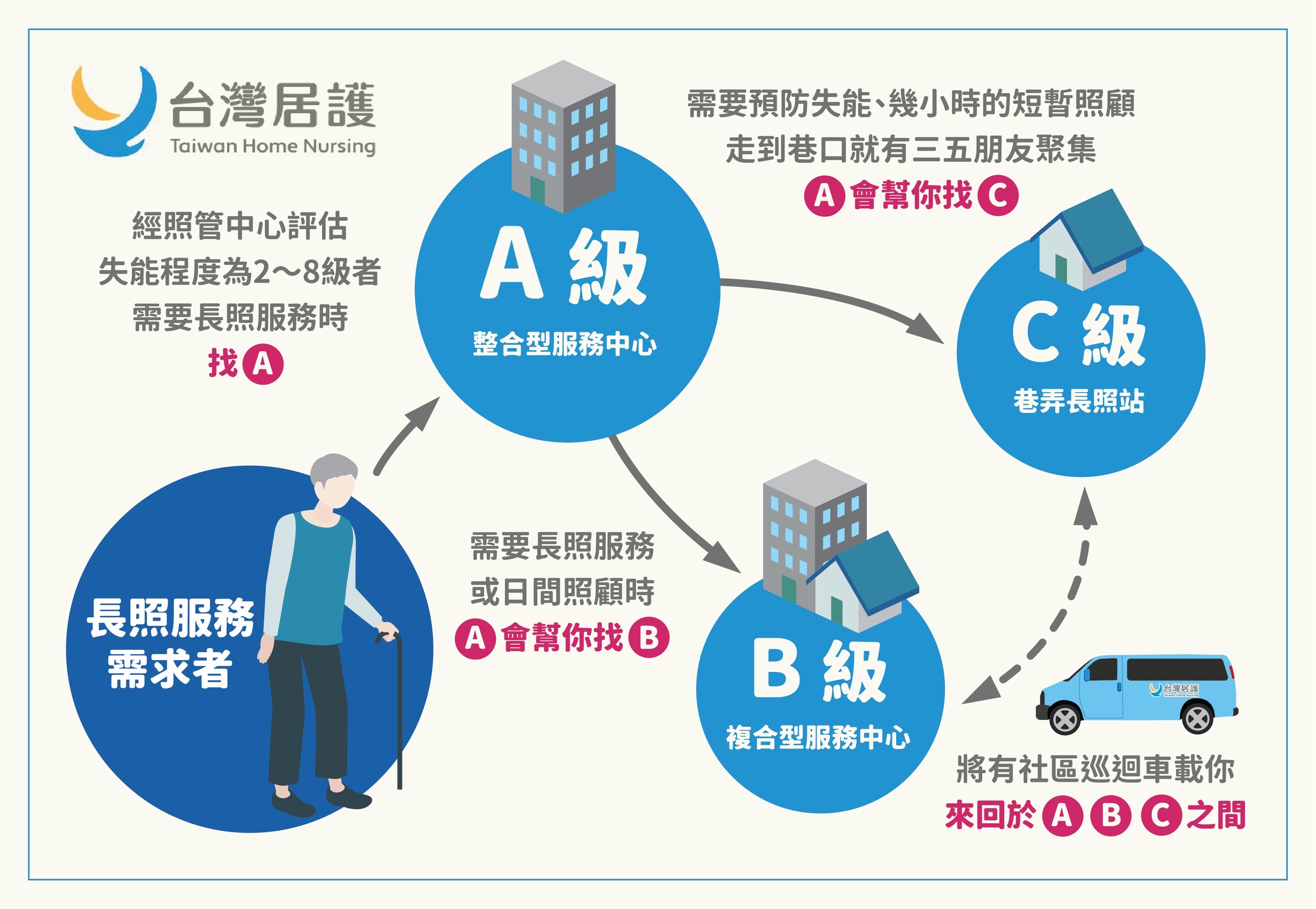 A單位是指為失能者擬定照顧服務計畫和連結長照服務的單位。 當需要長照服務的需求者或家屬提出申請時,本市照管專員會先到府進行個案失能評估,並核定其失能等級。 完成評估後,照管專員會將需求者轉派至A單位,由A單位的個案師負責擬定照顧計畫,並媒合社區中的B單位與C單位提供實際之服務。 |